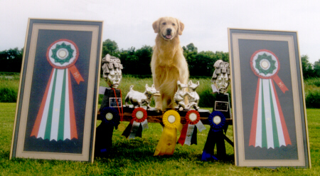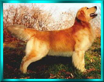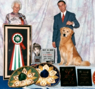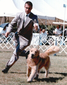 Strider is a multiple BIS, BISS, FCI BIS and Group winning dog, defeating over 10,000 in 1999 alone. He finished his Championship at 14 months and entered the GRCA Show Dog Hall Of Fame at 27 months, taking back-to-back Group 1's, and a major BISS. Handled by Erik & Megan Stridkland, Strider attained the rank of #2 golden for 1999.In June of '99 Strider & Erik attended the televised FCI World Series Of Shows in Mexico City, where Strider took 2 BIS placements, defeating some 9,000 in just 4 days! That same year he took one of the first JAMs at the GRCA National Specialty in Rhode Island. Now almost 8yrs old, still healthy, fertile and sound, Strider is a GRCA Outstaning Sire with close to 20 Champions, 5 SDHF Kids. multiple BIS and BISS WInners at Independent, Regional and National Specialties, a GRReview "Top 20" Winner, serveral kids with JAMs at both the National and Westminster, several Top 10 & 20 ranked dogs for the past several years. Strider also has many titled get in every form of multi-purpose competition. Strider has consistently been producing producing the same qualities in his kids that make him the outstanding showdog and stud dog that he is. Several of his kids have already produced multiple Champion kids of their own. He is also producing the incredible temperament, personality and attitide that has made him such a pleasure and a joy to live with. The #2 Golden for